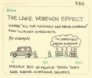 “The Lake Wobegon effect is a natural tendency to overestimate one’s capabilities and see oneself as better than others. Research psychologists refer to this tendency as self-enhancement bias and have found evidence for its existence in many domains.” Psychology Wiki