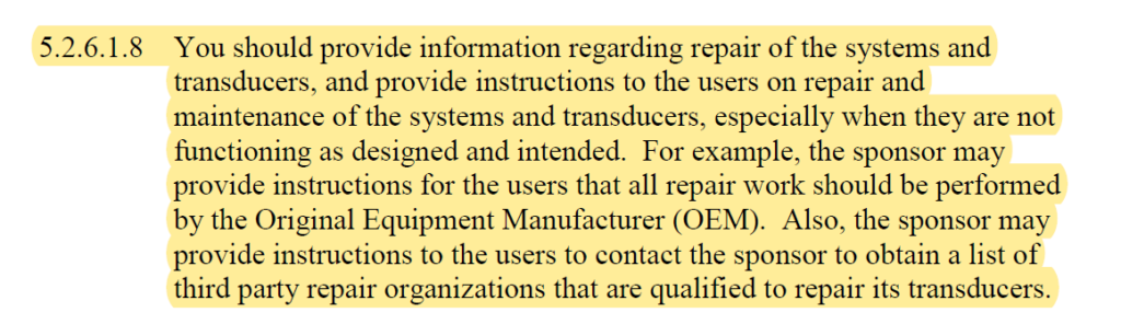 Section 5.2.6.1.8 below says that the sponsor (the OEM) may detail what can and cannot be replaced in a “repair” process. It also says the HTM can contact the OEM for a list of 3rd party organizations that are qualified to repair its transducers.