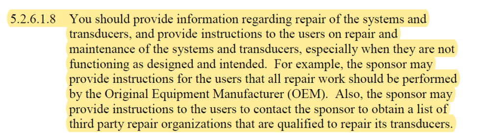 The new ultrasound Guidance document, https://www.fda.gov/media/71100/download, addresses, at least in part, two key issues related to the 3rd Party service docket that began some three years ago; specifically who can do service and remanufacturing and what the requirements are. With regard to servicing either systems or probes (aka transducers) the Guidance document (section 5.2.6.1.8 shown above) informs the OEM that they should; “provide information regarding repair of the systems and transducers, and provide instructions to the users on repair and maintenance of the systems and transducers, especially when they are not functioning as designed and intended. For example, the sponsor (i.e., the OEM) may provide instructions for the users that all repair work should be performed by the Original Equipment Manufacturer (OEM). Also, the sponsor may provide instructions to the user to contact the sponsor to obtain a list of third-party repair organizations that are qualified to repair its transducers.” This guidance puts the onus for determining what can be repaired and who can repair it squarely where it belongs; on the OEM. Further, the example used above relative to the user obtaining a list from the OEM of third-parties qualified to repair its transducers implies that the OEM has in fact qualified that third-party through an audit, thereby providing the user with a sense of security that its transducer will be repaired properly.